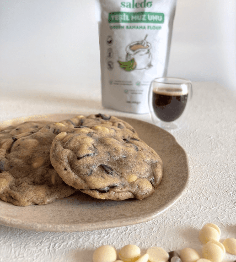 Biz de Saledo olarak Yeşil Muz Unu’nun glütensiz ve lifli yapısını mısır nişastasıyla buluşturduk, içine bolca bitter ve beyaz çikolata ekledik. Sonuç mu? Hem yumuşacık hem de ağızda dağılan, çikolatalı nefis cookieler!
