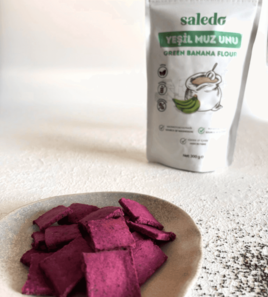 Biz de Yeşil Muz Unu ve badem ununu pancarın canlı rengiyle buluşturduk. Fırından çıktığında hem glütensiz hem de renginden mutluluk veren çıtır çıtır pancar krakerler soframıza eşlik etti.