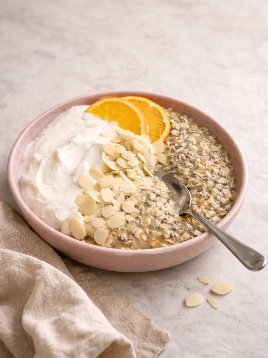 Chia ve yulafın doyuruculuğu, labne ve süzme yoğurdun kremamsı dokusuyla birleşir; portakalın ferah aromasıyla cheesecake lezzetinde, rafine şekersiz pratik bir tarif sunar.