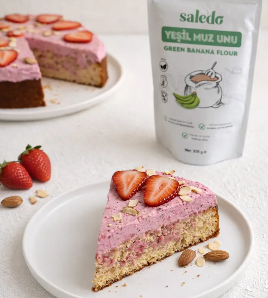 Sevgililer Günü’nde sevginizi en tatlı haliyle ifade etmeye ne dersiniz? 💕Saledo Yeşil Muz Unu ile hazırlanan bu lezzet; çileğin taze aroması, badem ununun dokusu ve elma suyu konsantresinin doğal tatlılığıyla Sevgililer Günü sofralarınıza leziz bir dokunuş katacak.🍓🍰💖
