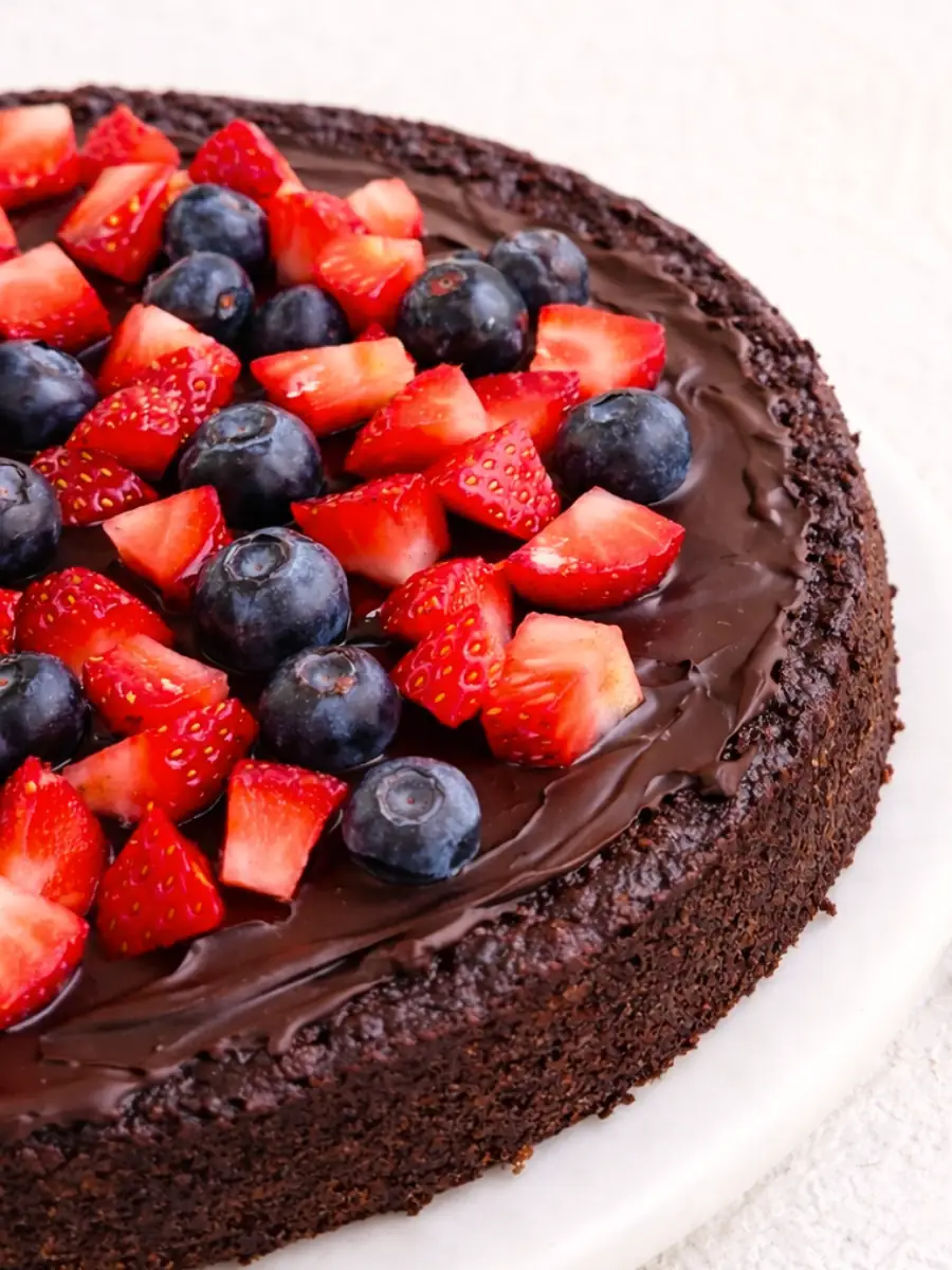 Remove the cake from the mold, then pour the remaining melted dark chocolate over the cooled cake and decorate with fruits.