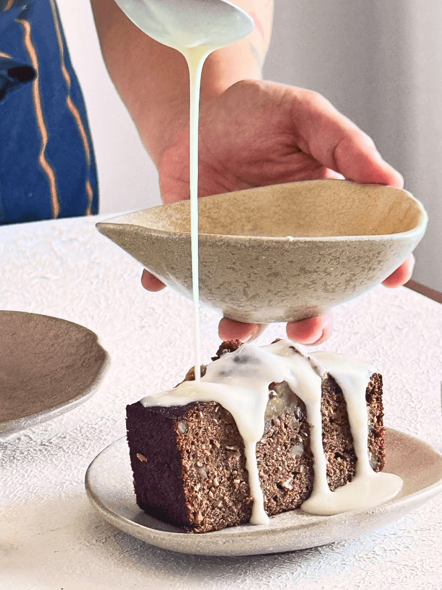 7. For the white sauce, whip the condensed milk and cream. Pour over the cooled cake and serve.
