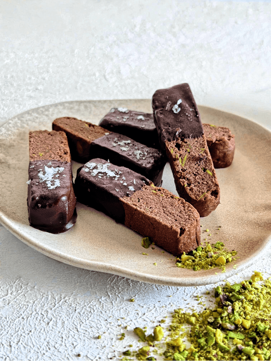 6. Dip the cooled biscotti in melted bitter chocolate using the bain-marie method and serve.