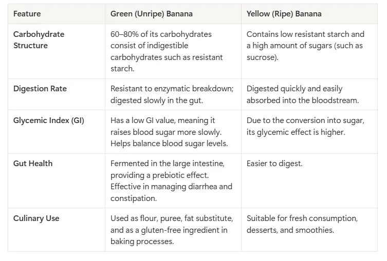 The Glycemic Index (GI) is a measure of how quickly and to what extent carbohydrate-containing foods raise blood glucose levels after consumption. Due to the increased sugar content that develops during ripening, yellow bananas are digested much more quickly. On the other hand, the resistant starch found in green bananas physiologically behaves like fiber, slowing down carbohydrate digestion. This slower digestion helps prevent sudden spikes in blood sugar, supports lower glycemic index meals, and contributes significantly to the prevention or management of conditions such as type 2 diabetes.
