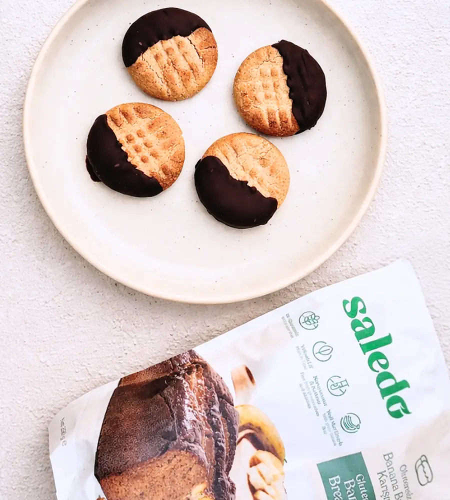 Peanut Cookies, prepared with only three main ingredients, bring together the intense flavor of peanut butter with Saledo Gluten-Free Banana Bread Mix! Finished with dark chocolate after baking, these cookies will become your new favorite with both their look and taste. This recipe, which is extremely effortless to prepare, is ideal for those looking for a gluten-free and refined sugar-free snack.